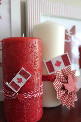I wanted to add some height to coordinate with the largest frame, so I added twine, designer tape, buttons and custom flags to a couple of red & white candles – love them !!!